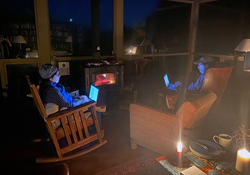 Our West Marin Community Fellows weathered the January storms, gathering and working by the fire. Photo: Elia Haworth.